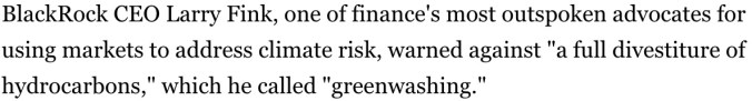 Larry Fink, the C.E.O. of BlackRock, warned against a “full divestiture” from fossil-fuel stocks, because it would be “greenwashing.” Not only is that statement contrary to his company’s own policies—BlackRock has made a conditional promise to divest from some coal-mining companies—it’s also a remarkably Orwellian use of an Orwellian idea. Greenwashing, in truth, is what Fink and his peers engage in when they announce their calls for Paris compliance or for net-zero carbon emissions by 2050 or the other dodges that, for the time being, allow them to keep lending vast sums of money to the fossil-fuel industry while insisting that they’re very worried.