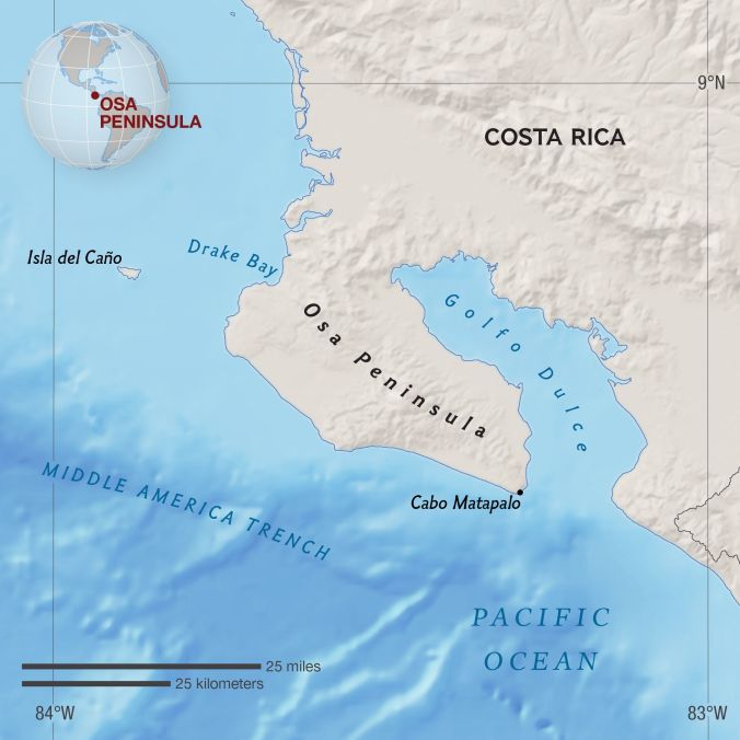After two visits in 2019 I wrote a quick note about the Osa Peninsula, and afterwards I found the map above on National Geographic’s website. A couple years have passed since those visits and National Geographic published this article that I somehow missed until now. Jamie Shreeve shares a history I was well aware of due to our four years managing Lapa Rios, and back then I heard versions of it many times in the first person; but here it is told better than by anyone else in my experience, plus accompanied by the kind of photography you expect from National Geographic (not included here out of respect for the copyrights of those images). The title notes the challenge facing the peninsula, and my bet is on the peninsula’s having the support it needs to survive: