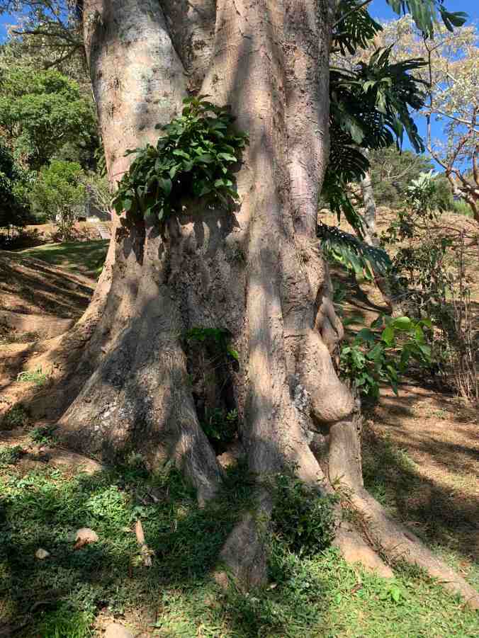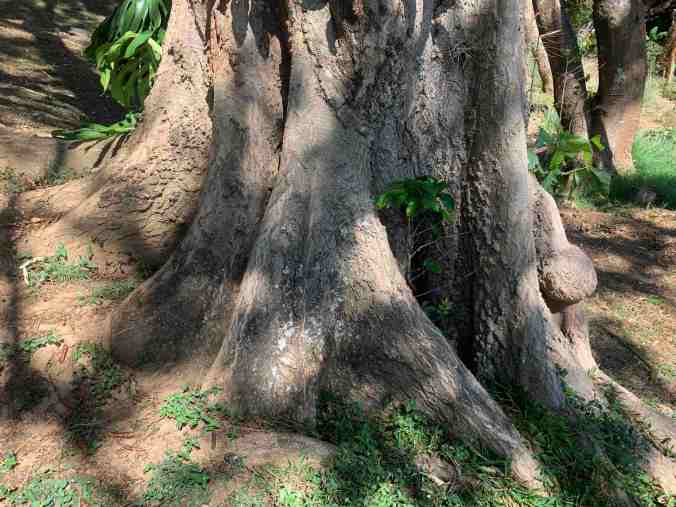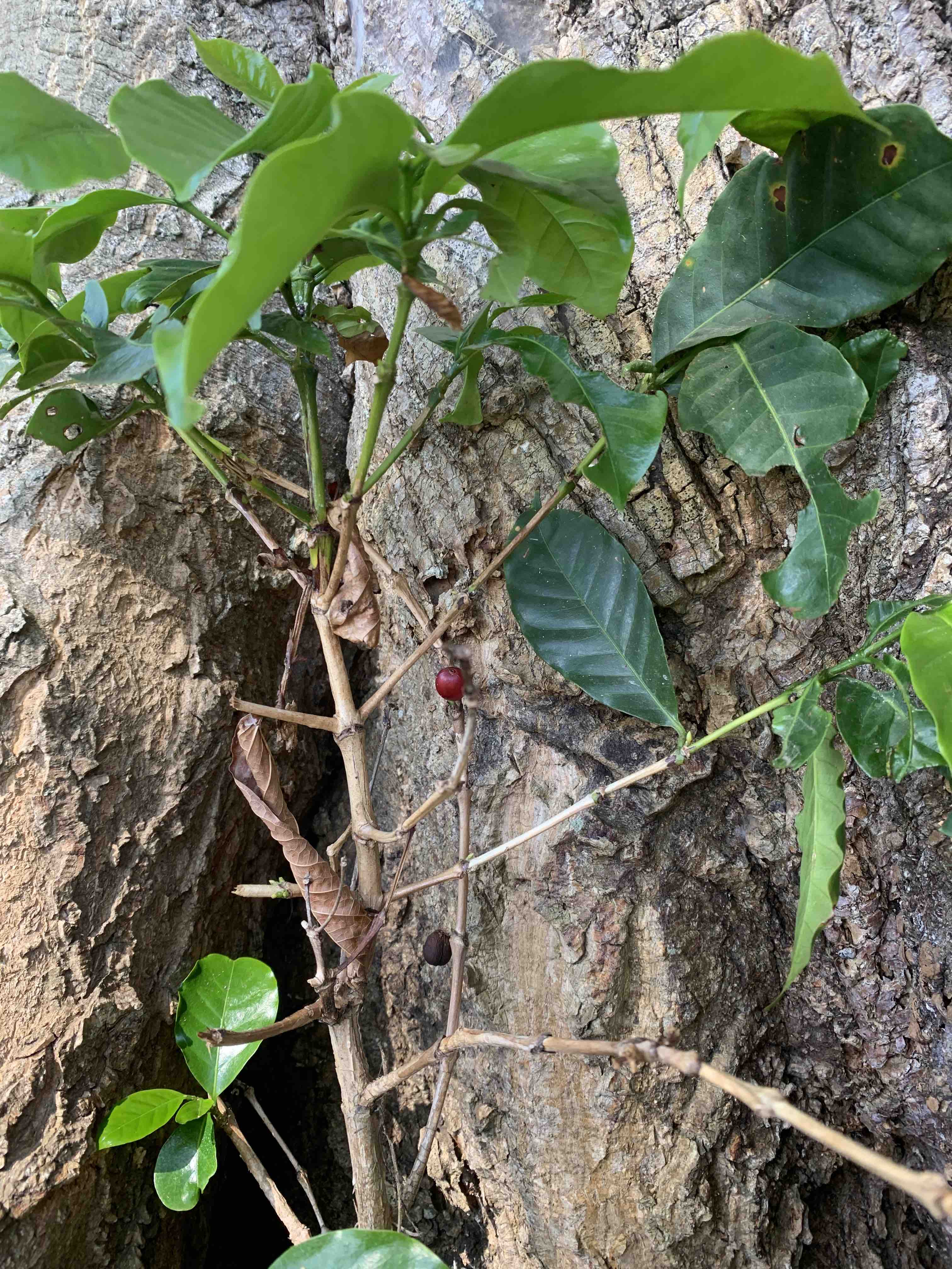 A coffee sapling is growing at the base of the old poro tree.