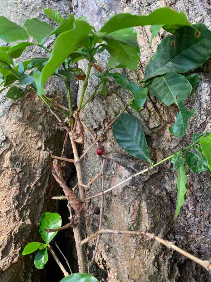 The seed for this young tree was most likely dropped into this location some years ago by a bird feeding off a nearby coffee tree. Our decision to re-plant coffee has received a vote of confidence, of sorts, by this happy little accident of nature.