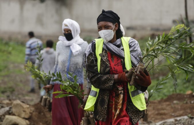 Women participating in Ethiopia’s mass tree-planting campaign in Addis Ababa last June. Ethiopia aimed to plant 5 billion seedlings in three months. MINASSE WONDIMU HAILU/ANADOLU AGENCY VIA GETTY IMAGES