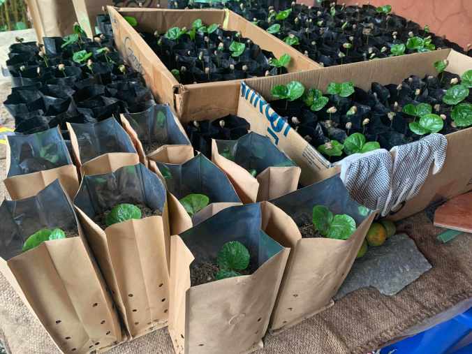 Kraft bags chosen to reduce plastic waste from more conventional coffee bags are convertible for re-use in planting trees–shown here as we move coffee seedlings to “second shift” planter bags