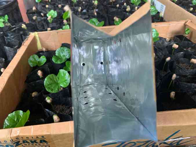 From the time we started packing coffee samples two years ago, well prior to the Authentica shops opening until now, I have been saving every Organikos coffee bag we use in our home, and collecting them from friends as well. I did not know what I would do with them, until it finally occurred to me to take a hole puncher and see if I could replicate the drainage of a typical agricultural planter bag (like the black ones in the photo below). With the bag folded and 7 well-placed punches, 26 holes result. This year we have close to 300 coffee seedlings, which I am now transplanting into the larger bags for the next phase of their growth.