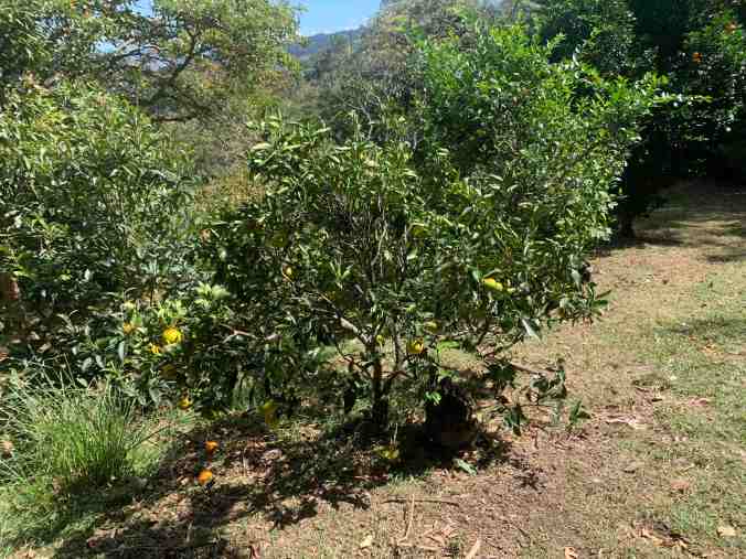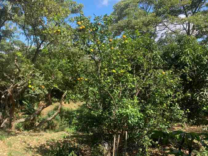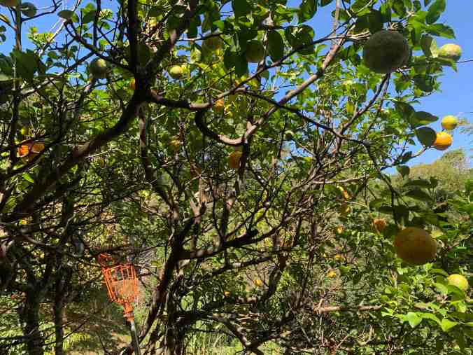 A mandarin orange tree across the property currently has at least 100 ripe fruits on it today. A few hours of harvest time. Even a smaller tree like the one below has 30 or so oranges of a different variety on it. An hour of harvest time.