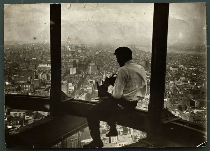 (Original Caption) A man sitting atop a girder over the city is shown taking photos of the unfinished municipal building.