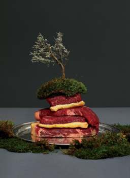 A beef rib lifter stacked with strip steak and a sagebrush tree. Photograph by Kyoko Hamada. Styled by Martin Bourne