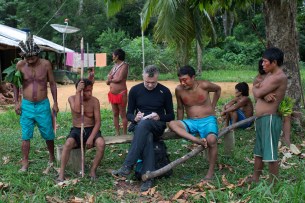Dom Phillips (center), seen here taking notes as he talks with Indigenous people, reported regularly for the Guardian. Photograph by Joao Laet / AFP / Getty