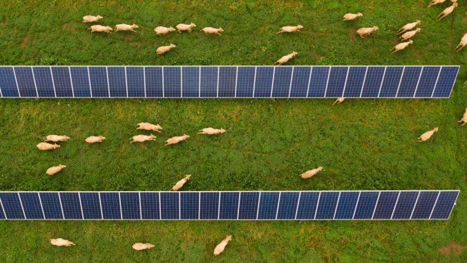 In a meadow in southwestern Germany, solar panels stand upright in long, thin lines, like a series of fences. While farmers raise hay in the wide spaces between rows, the vertical power plant generates carbon-free electricity for the nearby town. Across the border in France, both wine and watts flow from panel-topped vineyards. Tea grows under solar panels in Japan, while pollinators are nurtured in the United States. And from Canada to Australia, utility-scale solar farms producing power for thousands of homes share their space with sheep.