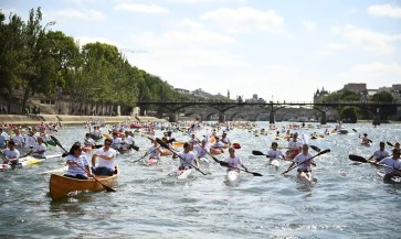 Paris mayor Anne Hidalgo and the co-president of the Paris bid for the 2024 Olympics, Tony Estanguet, paddle on the Seine in Paris. Photograph: Reuters