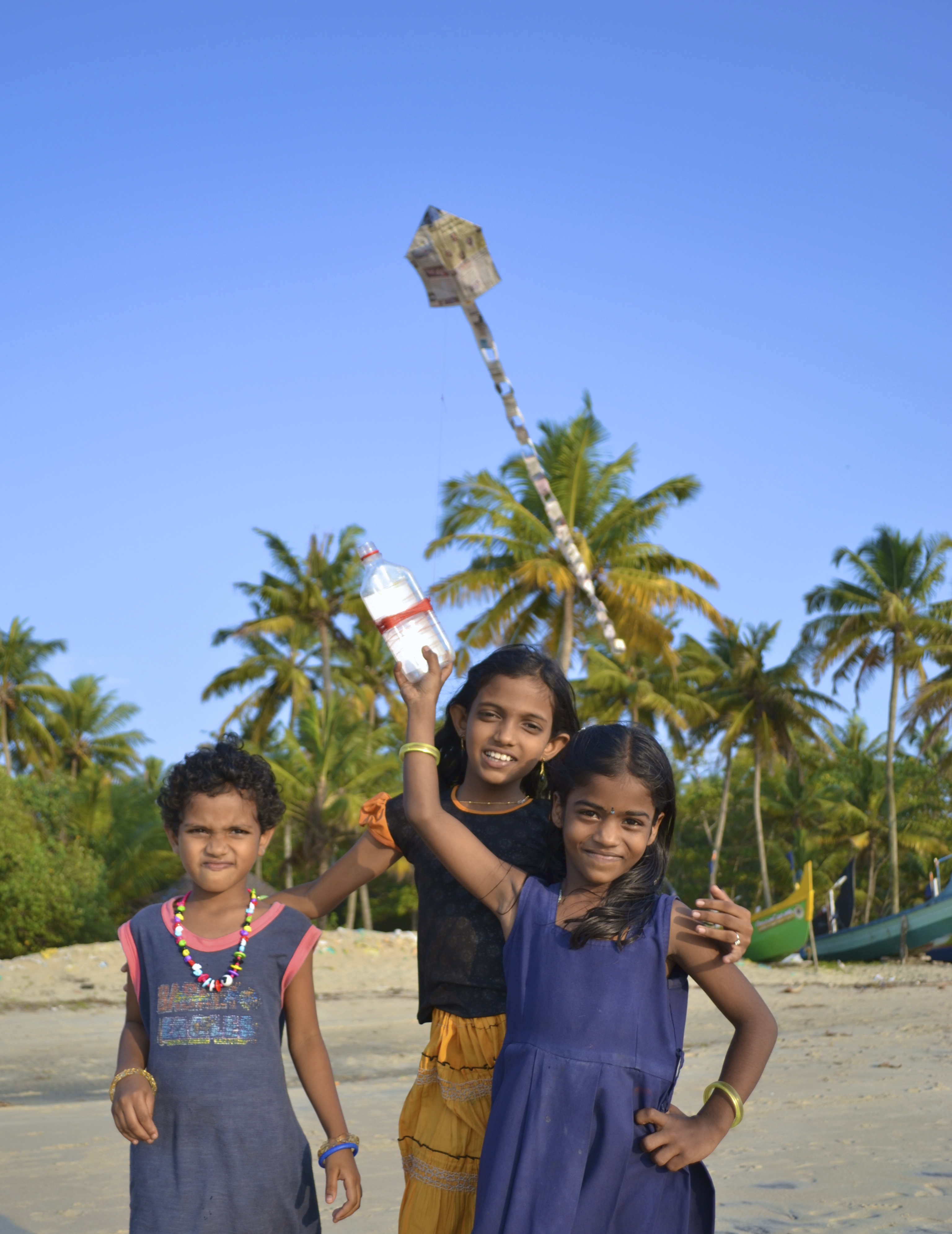 When land heats up and air rises, it gives way to fresh on-shore wind from the Arabian sea. A walk along Marari beach during sunset will most likely give the sight of homemade kites being flown mostly by children, but also adults of all ages. These kites are made of bamboo, newspaper and glue. Old fishing line is then attached and wound up on a bottle.