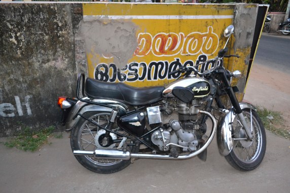 I arrived to Fort Kochi in the late afternoon in search of a Royal Enfield, a classic Indian-made motorcycle that I’ve had a crush on for a while now. The older models are “backwards” to the typical bike, with the gear foot-lever on the right side and the break lever on the left. I was determined to find the newer model where the arrangement is “normal”. After scouring the city and asking every bike rental and all the contacts available to me, it was apparent that there was no chance of finding what I was looking for. With that news I made the decision to go with what was available rather than what I wanted, (a perfect example of the flexibility that India demands) and I paid the Rs. 800, roughly $13 for the rental. I couldn’t believe what I’d just done: My first time driving in India and I’d rented a totally unfamiliar bike from an unfamiliar source with a 6 hour drive ahead of me, at night. My nerves were tingling at the realization!