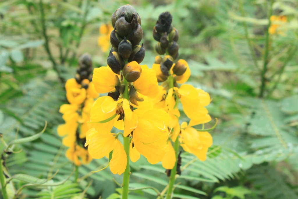 Cassia alata is an erect tropical, annual herb with leathery compounded leaves found in the Western Ghats of India. The plant grows quickly to a height of 6-12 ft and can live for many years. It has waxy yellow spikes on the tip of each branch for which reason they are also known by the name candle bush and seven golden candle sticks. The spikes elongates as the period of blossom progresses. Flowers are pollinated by carpenter bees and caterpillars of migrating butterflies feed on this plant. Continue reading