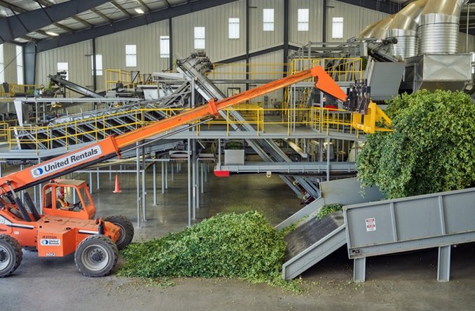 Hop bines being loaded into a machine that shakes out the aromatic cones (Photo: Spencer Lowell)