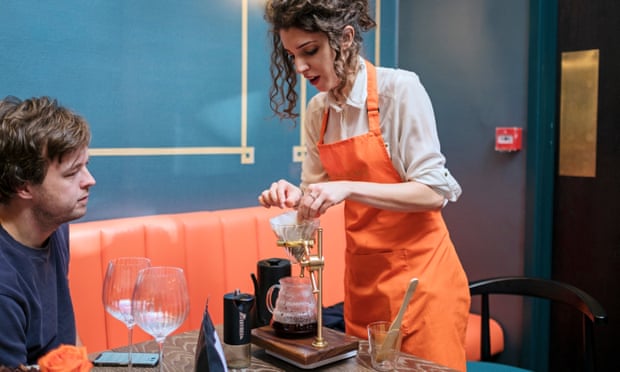 Archie Bland being served a very expensive cup (glass) of coffee at Queens of Mayfair. Photograph: Linda Nylind/The Guardian