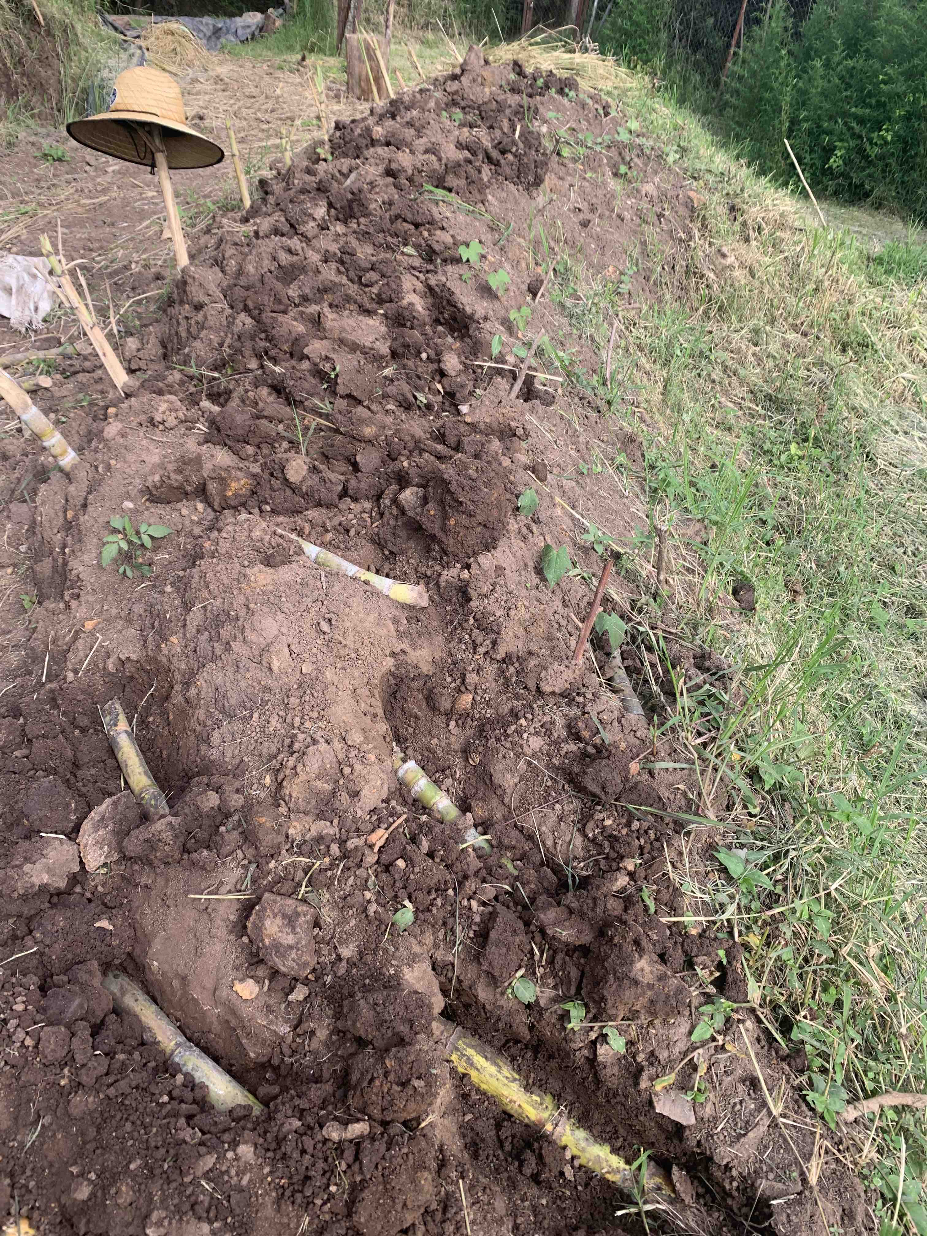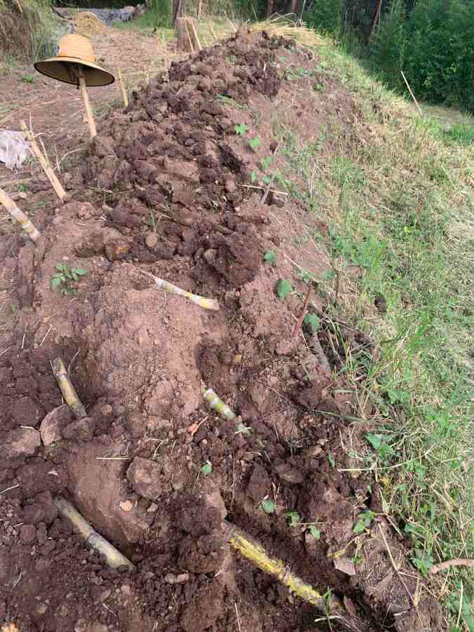 On the first day of this platform’s new decade I posted about harvesting sugarcane for the purpose of expanding the stock. Since then I took the long stalks and chopped them in to about 70 pieces, each between one and two feet long.   Here is what it looks like to plant it. Tops of stalks grow best inserted at a diagonal, as seen on the left of the image below, one serving as a hat stand. All other segments get planted horizontally in the soil, just a couple inches below the surface.