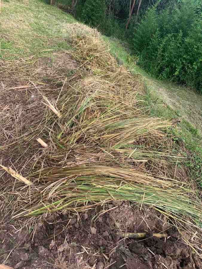 After covering each segment with compost-enriched topsoil, I cover the entire area with freshly cut vetiver grass. This protects the topsoil from the heavy rains typical this time of year, and at the same time allows the nutrients from the decomposing grass to fortify the topsoil.