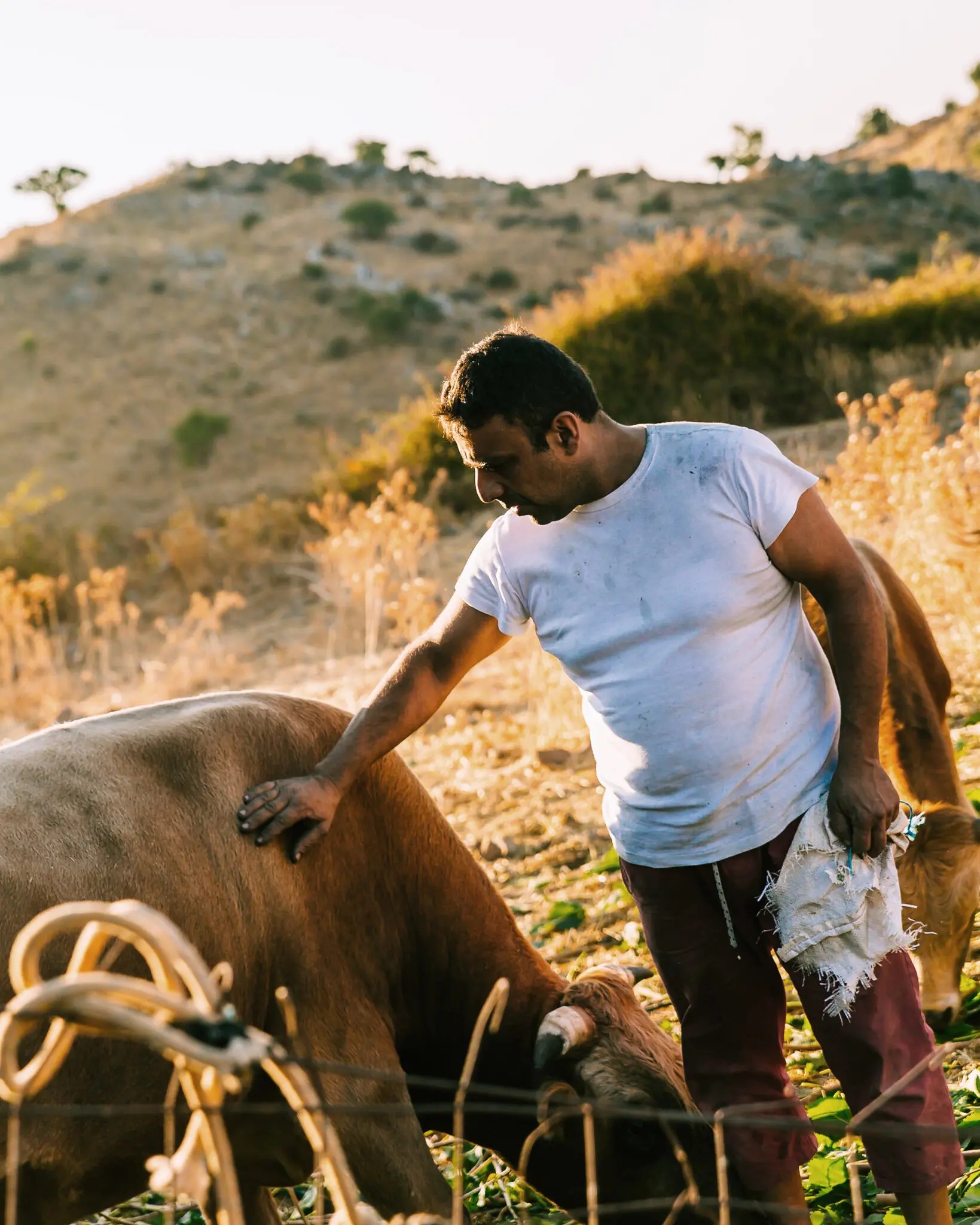 Stelios Trilyrakis, the chef behind Ntounias in Crete, pats one of his heritage cows, a rare Cretan species called Gidomouskara. SteMajourneys
