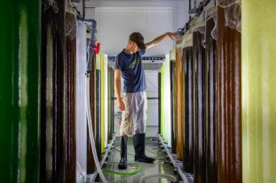 An image of a man in boots in a kelp hatchery