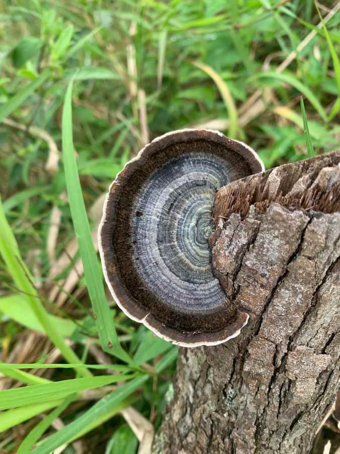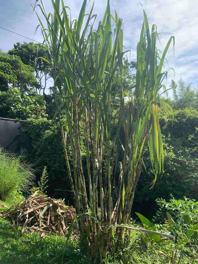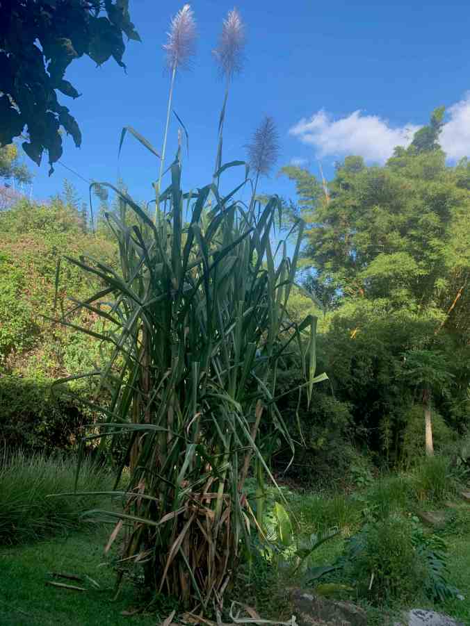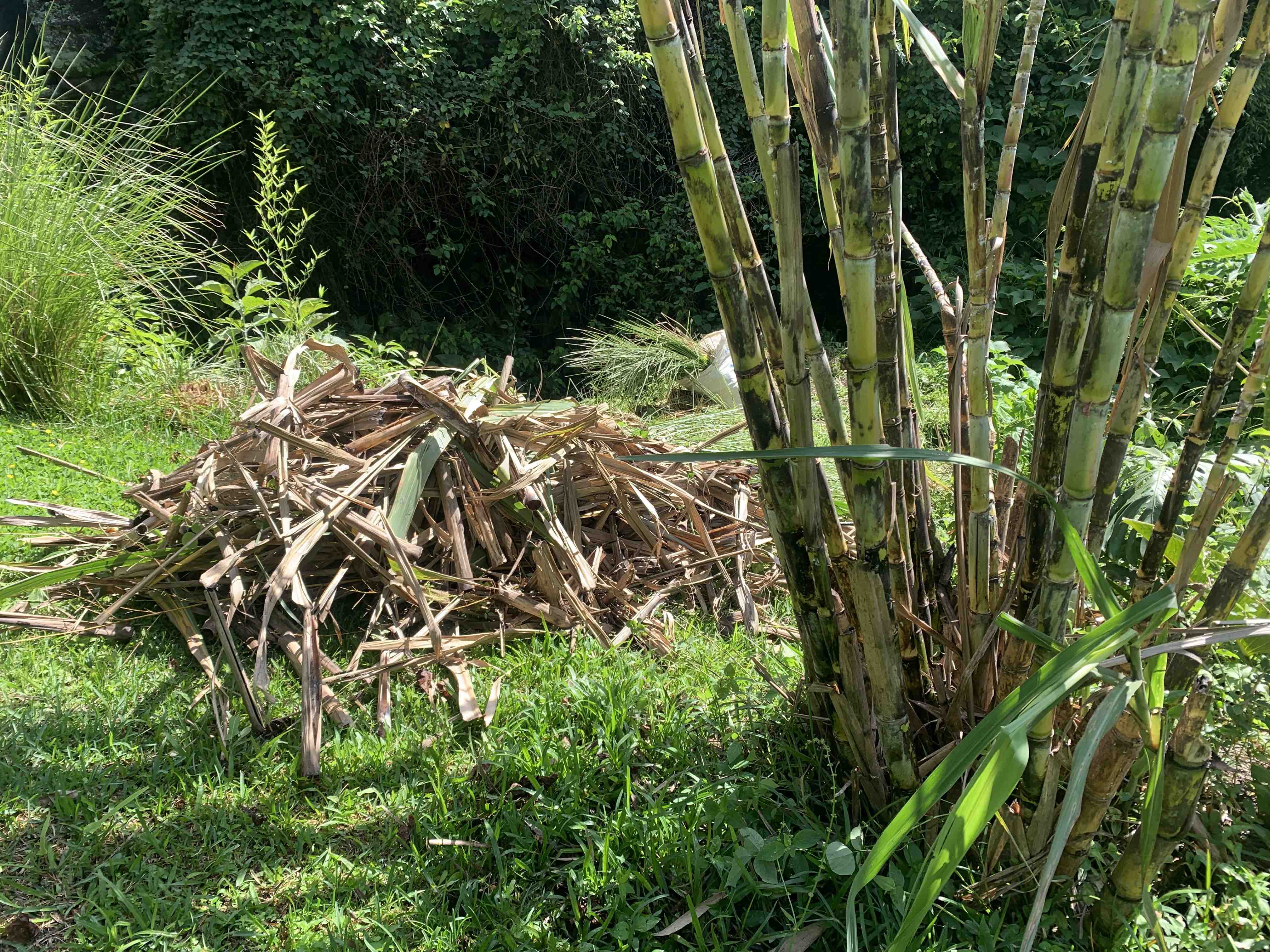 What looks like an elongated haystack curving downslope in this photo we call a berm. No hay there, just a mix of cut grass covering branches, logs, and such. The purpose of a berm, diagonally traversing this hill, is explained better by others. When we prune trees and bushes, cut grass, and find old logs on the land their biomass help build this berm. Recently we trimmed all our vetiver grass, a soil retention ally that grows waist-high in rows throughout our hills. We cut it back twice a year, and added it to the top of the curvy berm.