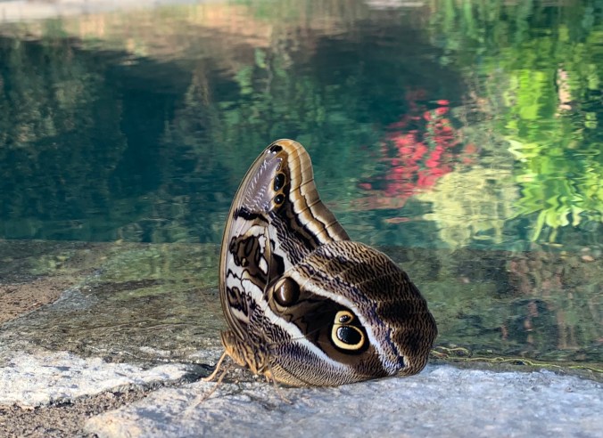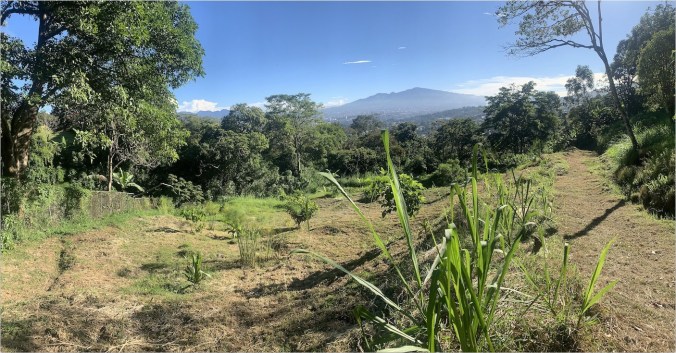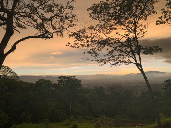 End of day, sunset time, back on the terrace of our home, an unexpected spectacle. In the photo below, which is looking due east, the sun is coming from the west, hitting Irazu volcano and lighting it up in such a way that it almost looks like golden lava is flowing down its cone. I’ll take that view, with thanks to whatever caused it.