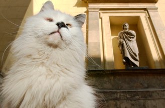 Vaska the cat, one of the Hermitage Museum mice hunters, seen in the museums yard, with an antic statue on the background, in St. Petersburg, in this April 25, 2004 photo. Cats have been part of the Hermitage’s security system since its founding days. (AP Photo/Dmitry Lovetsky)