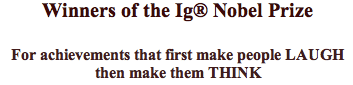 Ig Nobel Prize Winner Dr. Elena Bodnar demonstrates her invention (a brassiere that can quickly convert into a pair of protective face masks) assisted by Nobel laureates Wolfgang Ketterle (left), Orhan Pamuk, and Paul Krugman (right). Photo credit: Alexey Eliseev, 2009 Ig Nobel Ceremony