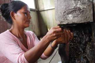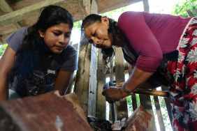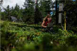 Gary Pickles, a ranger at Hadrian’s Wall Path National Trail, inspecting the Sycamore Gap tree shoots that recently appeared. Jason Lock/National Trust