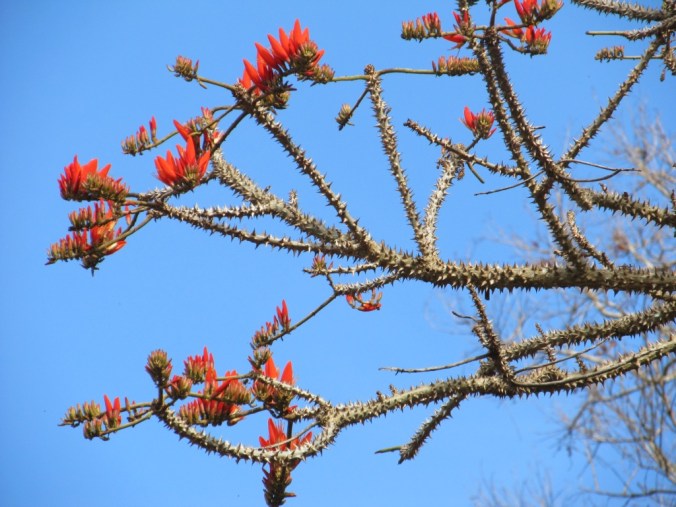 Two days ago, when I went for a morning walk in the Periyar Tiger Reserve, the spectacular show of bright crimson flowers attracted my eyes and forced me to stop and take photos. Due to the change of seasons, the trees are shedding their leaves and putting their energy into blooming flowers–and the results are fabulously picturesque.