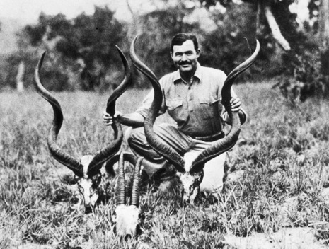 1937: American writer Ernest Hemingway (1899 – 1961) kneels while holding a pair of antelope horns during a safari, Africa. (Photo by Hulton Archive/Getty Images)