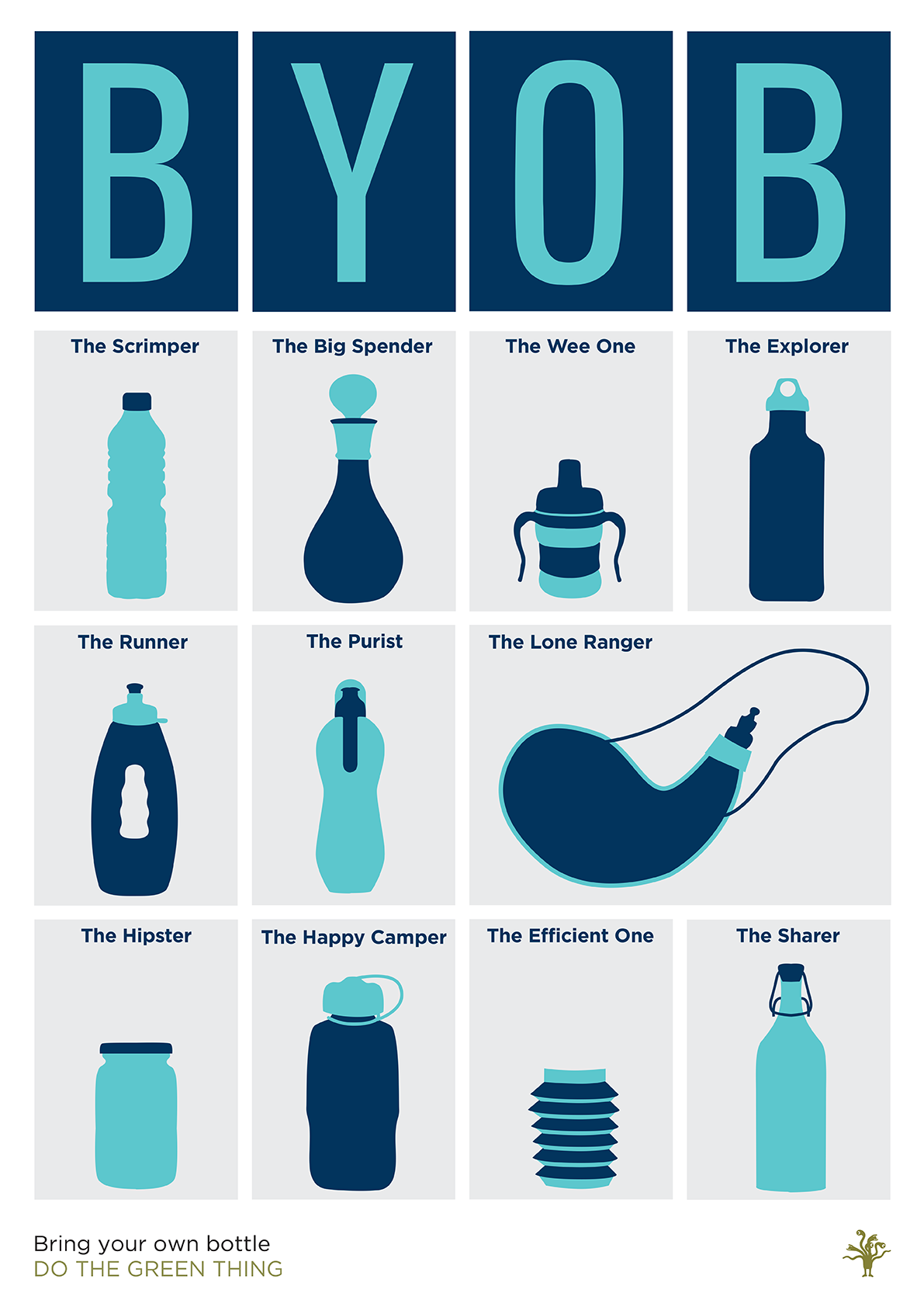 “The aim of my poster is to encourage people to carry their own bottle of tap water and avoid countlessly re-buying mineral water. I have used the well known acronym BYOB as a simple and straightforward way to communicate this message,” says Rebecca. “Bringing your own bottle is not only an easy way to reduce your global footprint, but it can be a great form of self expression!”