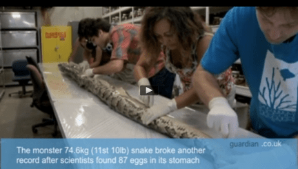 Click to the left to go to the 38 seconds of video on a topic we first posted about here. It has a bit of ick factor, but the topic is of enormous consequence for the original ecosystems where these wild animals come from, not to mention the innocent creatures they encroach on in their new habitats.