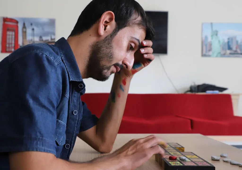 Hoshmand Mofaq, an Iraqi artist, pondered his next move on one of the Royal Game of Ur boards he designed. Mr. Mofaq is part of a group who hope to popularize and return the game to the Iraqi people as part of their cultural heritage. Shwan Mohammed/Agence France-Presse — Getty Images