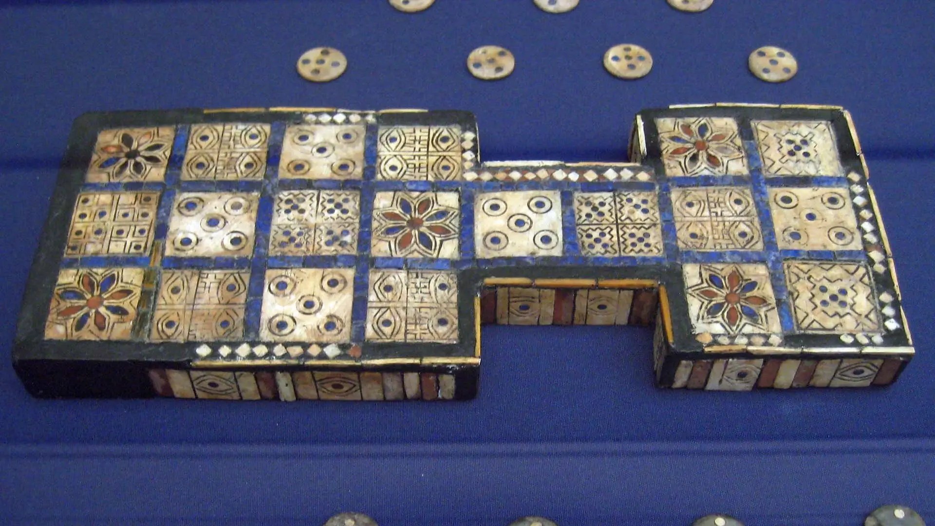 One of the boards of the Royal Game of Ur excavated in the 1920s, on display at the British Museum. The British Museum, via Commons.wikimedia.org