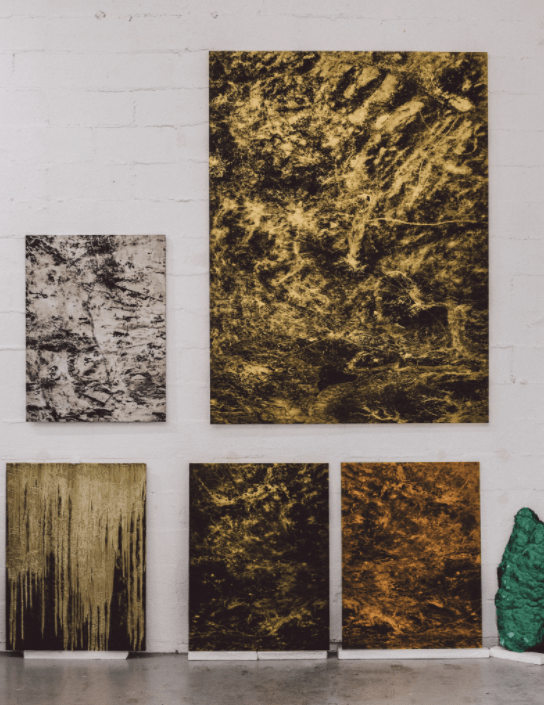 A series by Mr. Guariglia depicting the impacts of agriculture and mining on the Asian continent. The shimmering panels are layered with gold and other precious-metal leaf, gesso and acrylic ink. Below right is botryoidal slab of malachite from a mine in Africa. Credit Nathan Bajar for The New York Times