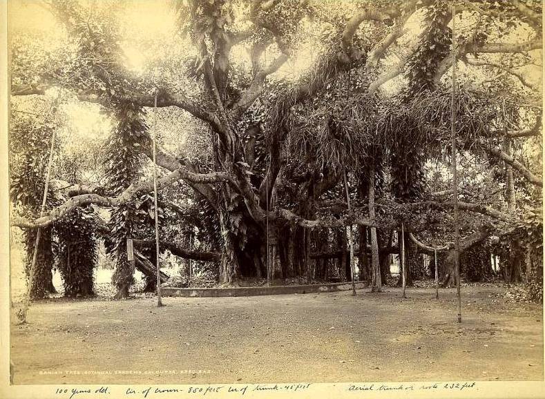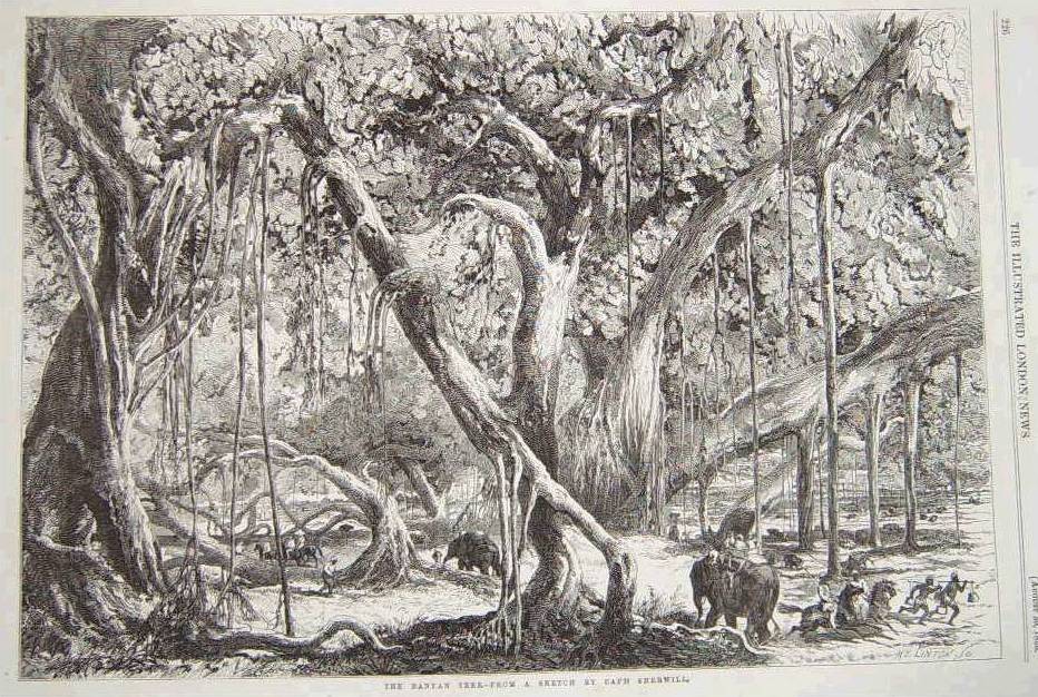 Banyans are large evergreen trees with aerial roots descending from branches that enter the ground and thicken and become strong enough to support the crown. The Banyan is sacred to the Hindus; they frequently stand guardian near temples and shrines. The figs provide food for variety of animal life and the leaves are fodder for elephants and camels. Banyan is the national tree of India.