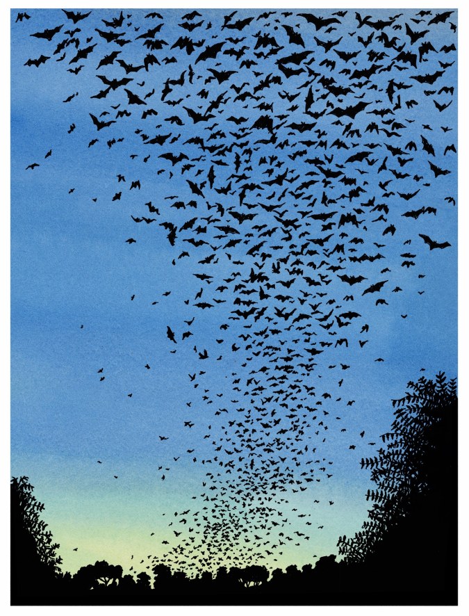 Bracken Cave, a collapsed sinkhole on the side of a lush limestone hill in southern Texas, is home not only to the world’s largest known bat colony but also to one of the largest concentrations of any mammal. More than fifteen million Mexican free-tailed bats live, for part of the year, deep in its recesses. One evening in late July, I visited the cave, situated just outside San Antonio, with a group of bat-curious tourists. As the sun went down, we watched hundreds of bats emerge every second, fifty yards from where we sat, swirling up in what our guide, Niki Lake, a volunteer from Bat Conservation International, called “a batnado.” They created their own breeze, with its own murmur—an ASMR-inducing summer buzz, insectivorous and thrumming, the sound of thousands of beating wings coming in waves. (Lake called the sound a “bat ocean.”) The show would go on for about four and a half hours, until every last bat that could fly had exited the cave. One member of our party said that, if he had discovered this place in prehistoric times, he would have thought it was a portal to another world. As he spoke, I felt a wet spot on my hand. A bat had peed on me.
