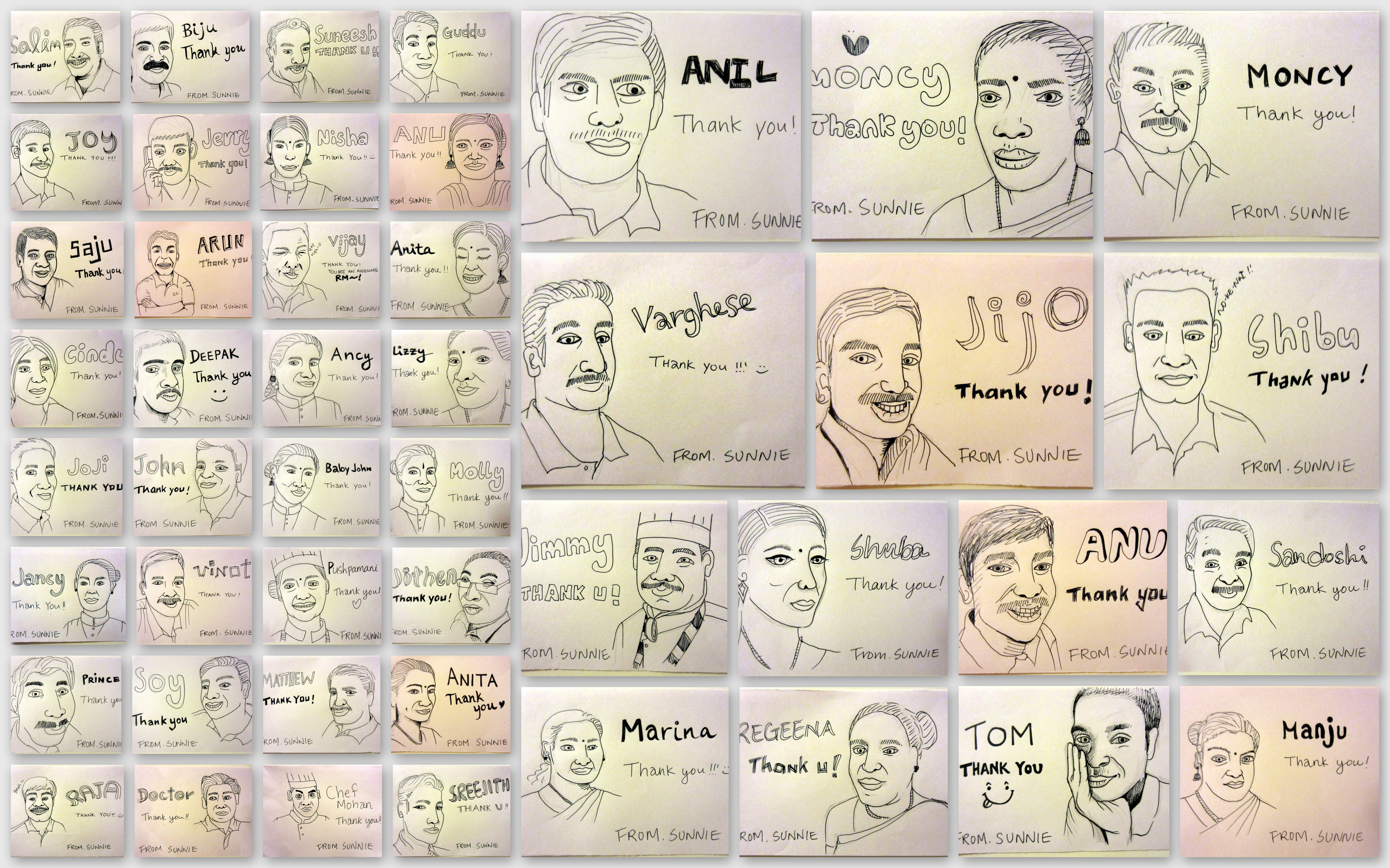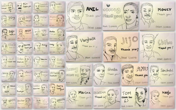 Even though I’m truly happy to be back at school, saying farewell to the staffs that I have been working with for more than 2 months was not easy. Every day I would pass by them saying “Namaskaram” which is “hello” in Malayalam or “Sukamano?” which is “how are you?” For every encounter, they kindly answered back to my poor Malayalam greetings and made my Kerala experience SUPER (as Indians often say)! To show my gratitude to all resort staffs, I drew some sketches as thank you notes. Thank you all, and I hope to see you soon. 🙂