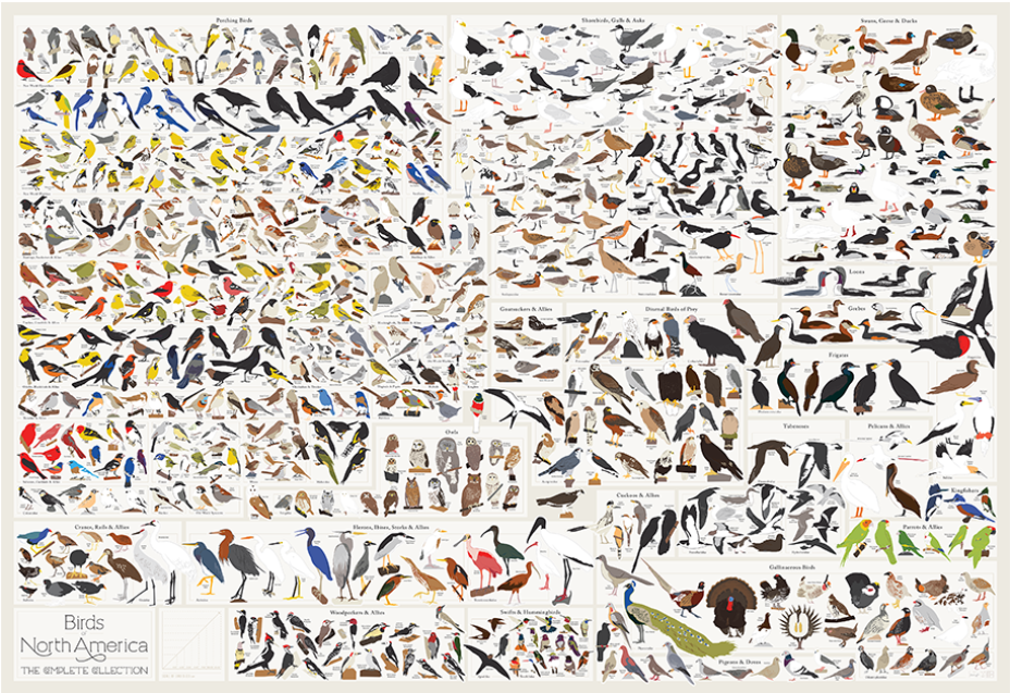 Perhaps our most ambitious taxonomical undertaking yet, this is your field guide to the birds of North America! The product of over 400 hours of intricate illustration work by our talented team of artists, this unabridged aviary features over 740 fair-feathered friends drawn to scale and sorted by species, covering the continent’s avifauna (both native and introduced, as designated by the National Audubon Society and the Cornell Lab of Ornithology) from common sparrows, jays, and owls to rarer birds such as the Greater Sage-Grouse, the California Condor, and the Whooping Crane. An ornithological opus like no other, this classificatory treasure is perfect for amateur and eagle-eyed birdwatchers alike. Continue reading
