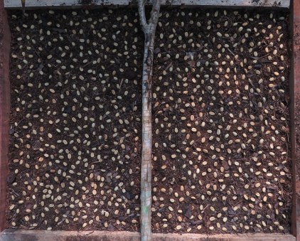 After we had gone, José Luis remembered to add a layer of dead leaves on top of the soil to help keep in the moisture and recreate natural conditions of the forest floor. Later, we went to visit his friend who had sold us the Borbón we planted earlier last month, so that James and I could see what our seedlings would eventually look like as they were transplanted into the black plastic bags we knew so well.