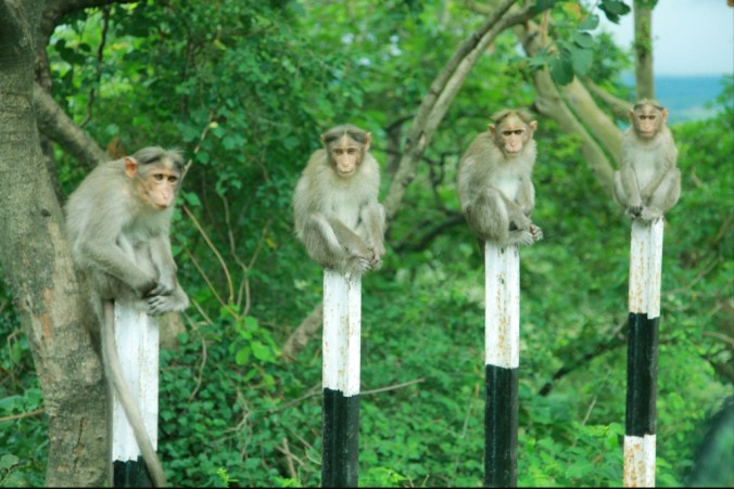 If only to illustrate the contrast between the cool, sleek Nilgiri langur and the pesky, marauding band of bonnet macaque, I offer this beautiful photographic evidence captured by the one and only Sung, whose telephoto abilities far outstrip my own. Sung was (un)fortunate enough to meet this savvy bunch on the roof of the resort restaurant where he had been pleasantly snapping pics of the local bat population (more on them later, I can assure you, esp. now that Sung is on the case). He called to me from across the property, gesturing wildly, and shouting something along the lines of: ‘There are like a thousand monkeys up here!’ Credulous as ever, I thought perhaps there were in fact a thousand monkeys and sprinted from my seat to witness the fracas. (Un)fortunately, I found a mere twenty-ish, a far more manageable pack than the thousand-strong throng promised me. I looked on rather unimpressed. But the high-pitched excitement in Sung’s voice revealed his fundamental anxiety in the face of his first, true encounter with the MACAQUE.
