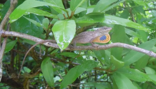 However, one animal I have been able to identify is a little lizard that I found while walking a trail. More specifically of the family Polychrotidae, or an anole lizard, the species I was lucky enough to encounter was the indigo-throated anole, Anolis sericeus. I have learned that all anoles have at least some ability to change color, they all have dewlaps, which are cartilaginous frills below the neck, and, like many lizard families, they can relieve themselves of their tail if sufficiently threatened. Fortunately my presence was only frightening enough for the anole to reveal its beautiful frill and, as I approached for a close-up, run off.