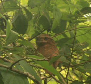Yet on the way down from the clearing these minor travails were justified as, after tramping through another patch of thick grass, our guide told us to be still while he pointed to what looked like a lump of tree–but with eyes. Deepthi whispered to me that we were seeing a Sri Lankan (or Ceylon) Frogmouth, a nocturnal bird native to the Western Ghats, whose skill at camouflage makes you about as likely to spot it as one of the Periyar’s 50 tigers. I can say very honestly that I have never seen a bird I was so taken with, with its wide-set and perfectly round eyes, and its blocky, brown, and perfectly rigid form. Because the Frogmouth hides in the daytime by keeping still, we were able to get unusually close to it for a good while before it was threatened and flew off to a tree with thicker foliage.