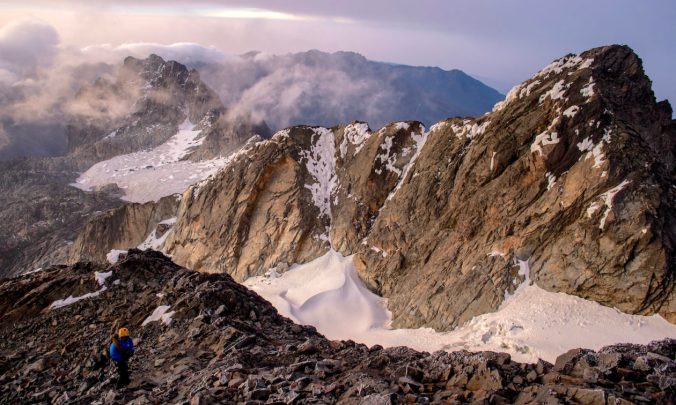 Margherita Peak, with mountain guide Uziah Kule (lower left) ascending. The Stanley Glacier is in the background. JOHN WENDLE