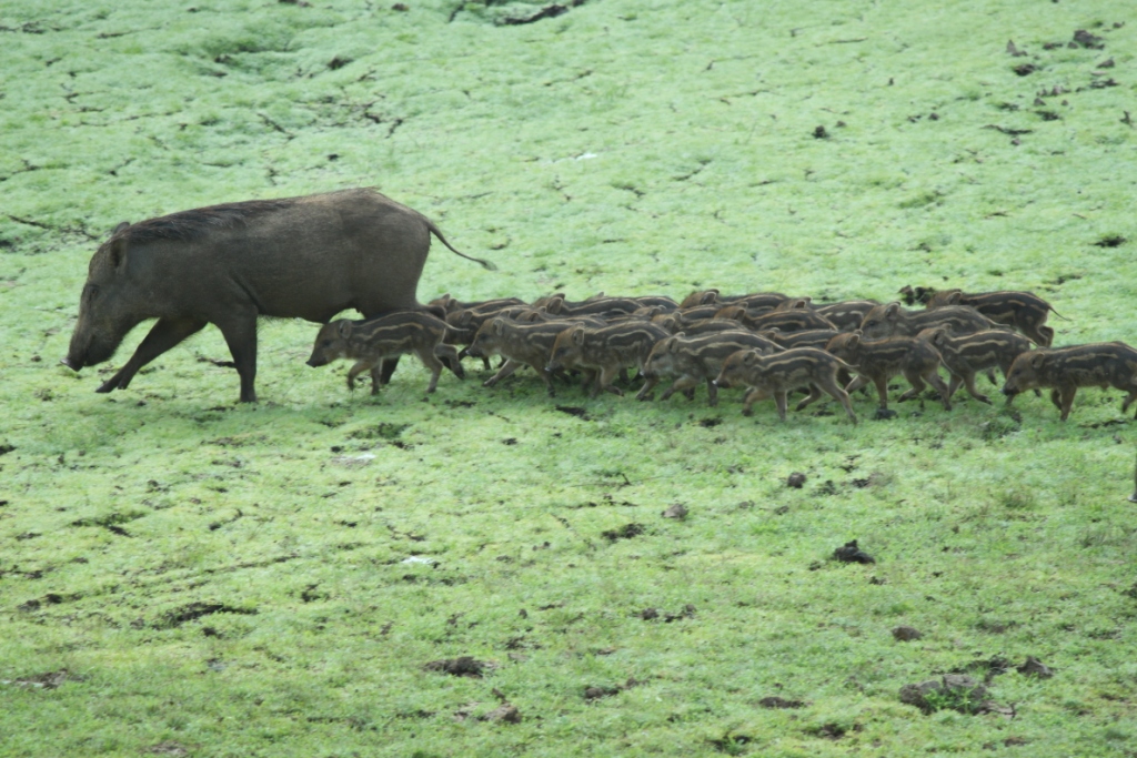 Early this morning my friends and I had a walk in the Periyar Tiger Reserve. My friend Mr. Senthil was looking toward the banks of the Periyar Lake when he found a herd of piglets marching with their mother.